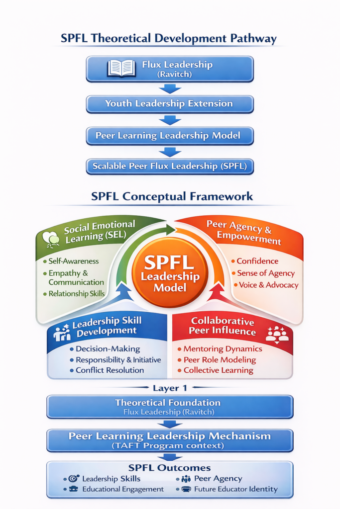 Scalable Peer Flux Leadership (SPFL) is a research-informed framework that builds on and extends Dr. Sharon Ravitch’s Flux Leadership and the leadership concepts presented in Leadership Mindsets for Adaptive Change: The Flux 5 into youth leadership development contexts, particularly within peer tutoring and mentoring environments.